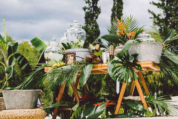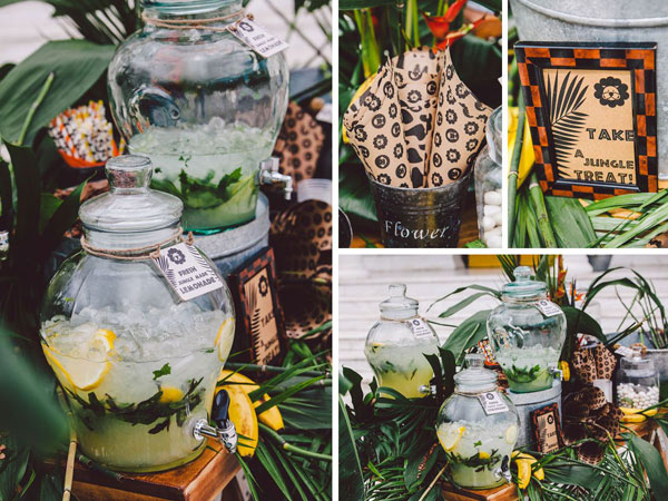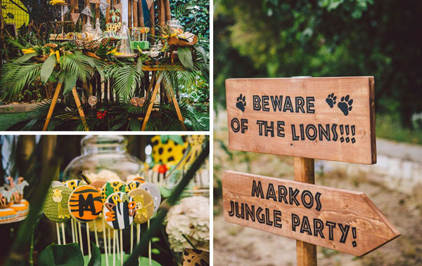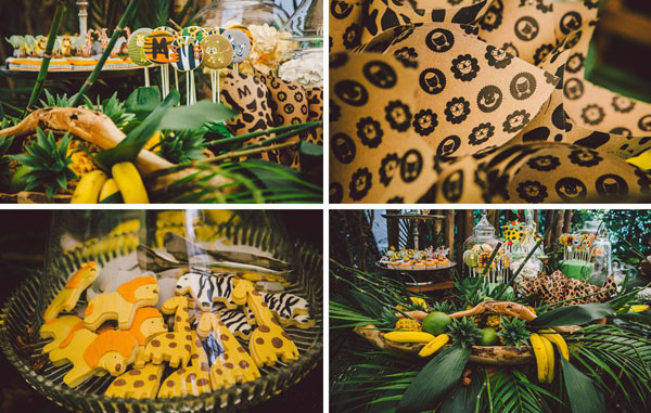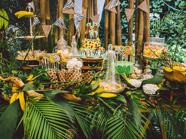 Главные тематические узоры, используемые в декоре - это принты различных зверей, таких как полосатая зебра, тигр и пятнистый леопард. Они прекрасно смотрятся как в праздничном оформлении, так и в угощениях на сладком столе. Сочетая эти узоры с зелёными тропическими оттенками получаются эффектные декорации, ассоциирующиеся с природой диких джунглей. Большие лианы и тропические листья во всем своем многообразии прекрасно смотрятся в декоре, имитируя праздник прям в центре Африки.