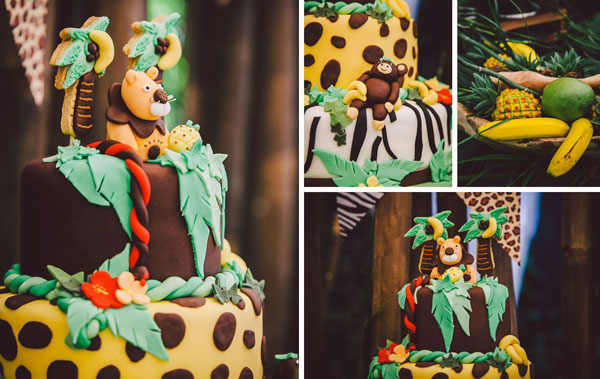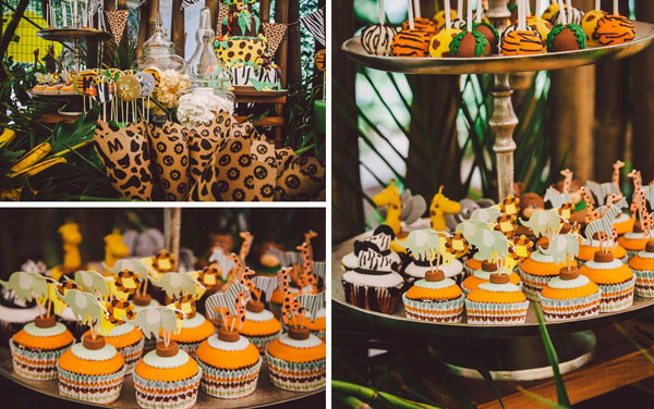 Окрас жирафа в желто-коричневом цвете, черно-белая зебра, леопардовые принты - прекрасные узоры, используемые в декоре и угощениях тематического сладкого стола. Это в первую очередь трехъярусный торт, где каждый слой стилизован под окрас африканского животного. Верхняя часть торта украшена фигурками зверей и пальм, а на фасаде красуются симпатичные обезьяны, экзотические цветы и фрукты. Печенье в виде фигур слонов, львов, жирафов и зебр, разложенные на подносах, символично красуются на праздничном столе. Капкейки с топперами и фигурками животных на многоярусном кейкстенде, кейкпопсы символизирующие узоры шкуры тигра, зебры и жирафа, смотрятся на сладком столе бесподобно.